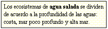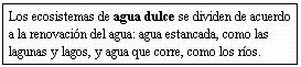 | Los ecosistemas acuáticos son aquellos en los que los animales y plantas viven o se relacionan con seres vivos en el agua. Dependiendo del tipo de agua podemos definir distintos tipos de hábitat acuáticos: de agua dulce y de agua salada . Si tomamos en cuenta otros factores abióticos, podremos subdividirlos: ![]() ![]() ![]() ![]() ![]() ![]() ![]() ![]() ![]() ![]() |